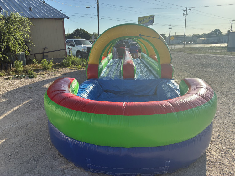this double lane slip and slide lets you race you friends down to the other side